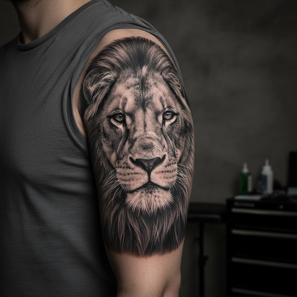 Realistic dövme, fotoğraf kalitesinde detay ve gölge çalışması içerir.