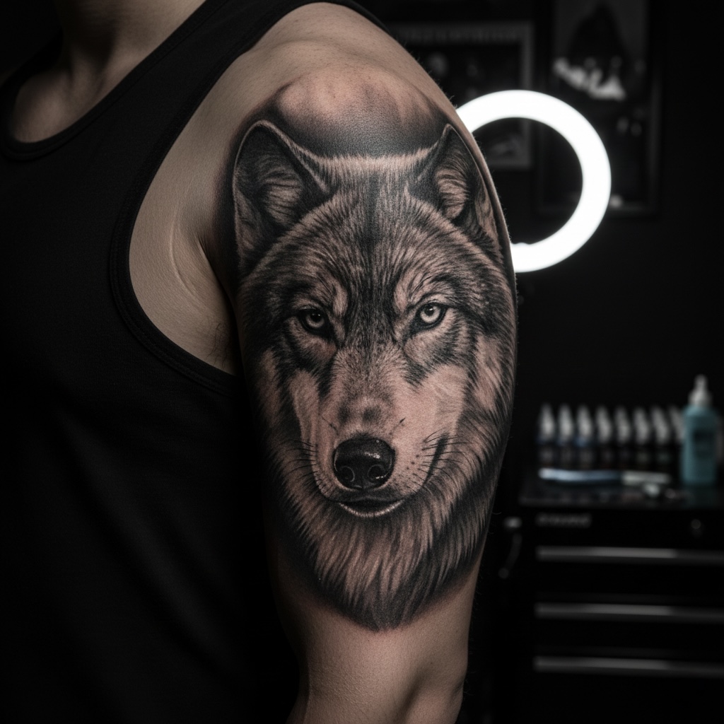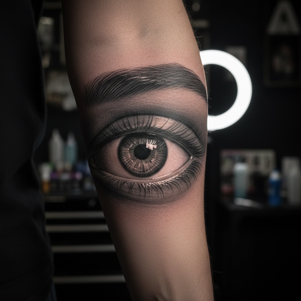 Realistic dövme, fotoğraf kalitesinde detay ve gölge çalışması içerir.